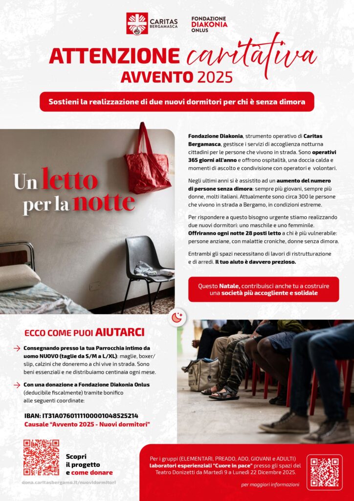Per l’Avvento 2025 Caritas Bergamasca, nel suo 50esimo anniversario, invita tutti i fedeli a contribuire a un importante progetto per la realizzazione di due nuovi dormitori, femminile e maschile, nella città di Bergamo. Le due strutture potranno accogliere fino a 14 donne e 14 uomini senza dimora, garantendo un riparo per la notte e la possibilità di avviare un percorso di uscita dalla grave marginalità.